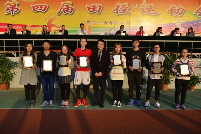 经过一天的紧张比赛,第四届田径运动会落下帷幕。下午4:30,举行闭幕式暨颁奖大会。院领导程建军、徐国华出席大会,体育部主任张彪主持大会。会上,党办、院办主任刘贵友宣读本届运动会“体育道德风尚奖”、“优秀裁判员”、“优秀运动员”获奖名单。程建军、徐国华为团体总分前六名和获得“体育道德风尚奖”的学院颁奖,副院长徐国华致闭幕词。