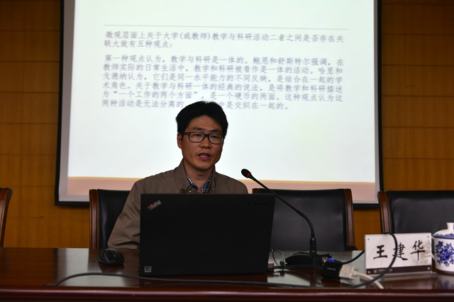 王建华报告的主题是“重温教学与科研相统一”。他对教学与科研的关系进行了简要分析,从教学与科研相统一的迷思谈起,指出教学和科研的教育性危机所在。最后他重申“教育与科研相统一”的意义和价值,倡导教师要有“知其不可为而为之”的精神追求。