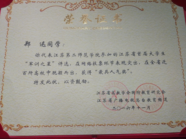 11月27日下午,江苏省首届大学生“军训之星”颁奖典礼在省广播电视总台教育频道举行。省教育厅副厅长朱卫国出席活动,92所高校的相关负责同志、指导教师和参赛选手参加颁奖典礼。我校生命科学与化学化工学院退役女兵郑迅同学参加该比赛并获评江苏省首届大学生“军训之星”最具人气奖,我校获得“优秀组织奖”。