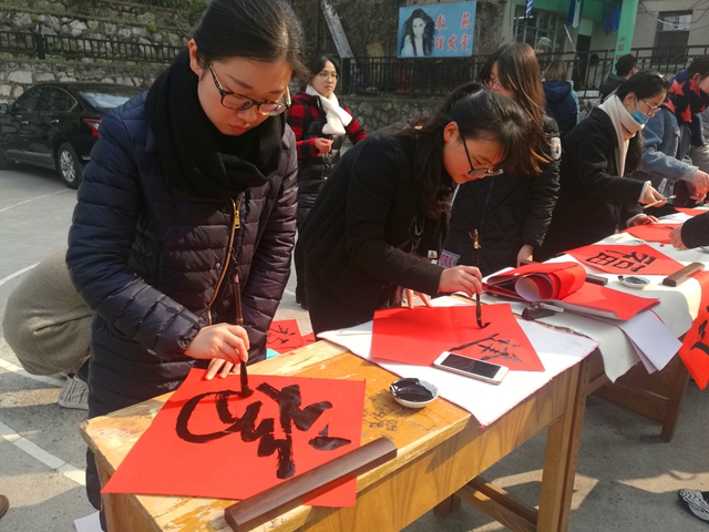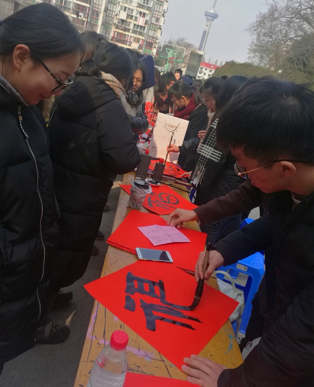 活动一开展,现场就被围得水泄不通,党员老师和学生即席挥毫,挥洒自如,一幅幅喜庆、吉祥的对联从党员老师和学生的手中潇洒而出。短短两个小时,近一百幅满载温暖的春联和福字送到了广大师生们手中,受到了大家的纷纷赞赏。
