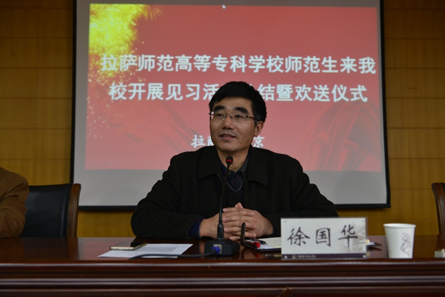 徐国华代表学校致欢送辞。他总结了拉萨师专师范生见习情况,对见习生的表现表示肯定,对见习活动取得圆满成功表示祝贺,并祝愿见习学生在以后的生活、学习和工作中展开双翼,飞得更高、看得更远。