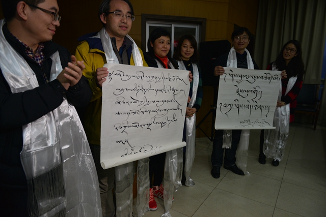与会人员合影留念,拉萨师专学生向我校参会领导敬献哈达。