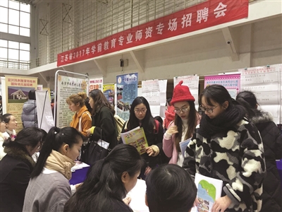 昨天,江苏省2017年学前教育师资专场招聘会在江苏第二师范学院举办,江苏9所高校学前教育专业毕业生参加了招聘会。现场来了145家参会单位,其中公办幼儿园比例达到90%,另有10%的民办园和民办普惠园。