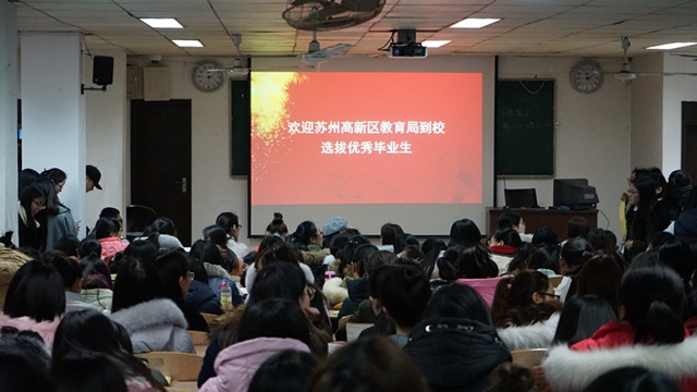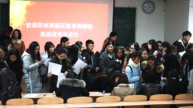 我校共有342名毕业生踊跃报名,参加了23日下午在草场门校区举行的笔试,笔试过线138人。24日上午,苏州市高新区教育局对笔试过线的同学进行了写教案、试讲的考核,考察其实践教学能力,考核通过的同学进入面试。最终共有44名毕业生正式录用为备案制公办教师。