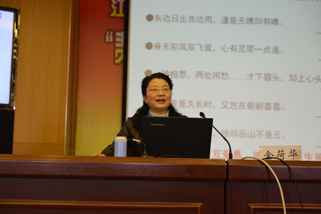 金荷华发言的主题是“爱情教育:人格养成的重要因素”,她从爱情内涵的诠释、爱情教育的重要性、爱情教育的途径及策略三个方面解读了爱情教育,指出:爱情教育,是发展学生“核心素养”的必备环节。她鼓励同学们阅读经典、正视价值观多元化的社会现实,辩证分析爱情婚姻中的道德、精神与物质问题,不断提升自我。