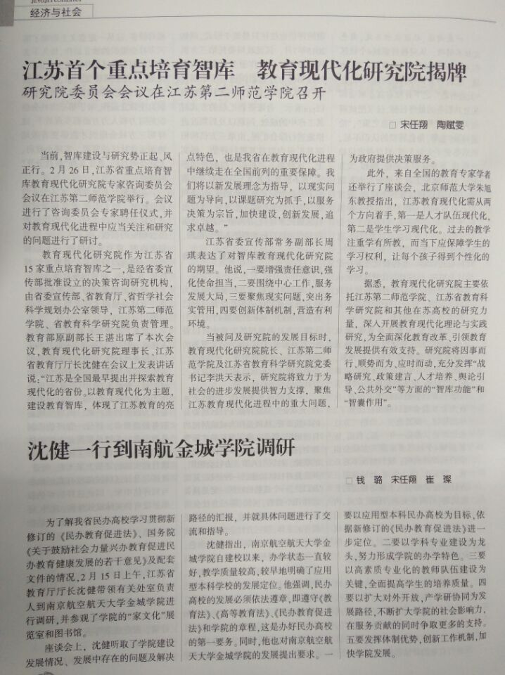 [金陵瞭望] 江苏首个重点培育智库 教育现代化研究院揭牌