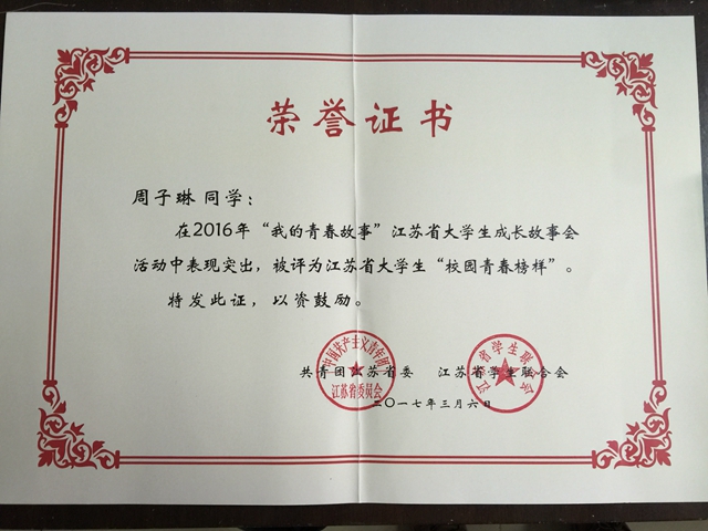 日前,现代传媒学院2014级广播电视编导班周子琳同学被共青团江苏省委、江苏省学联授予2016年江苏省大学生“校园青春榜样”荣誉称号。