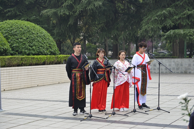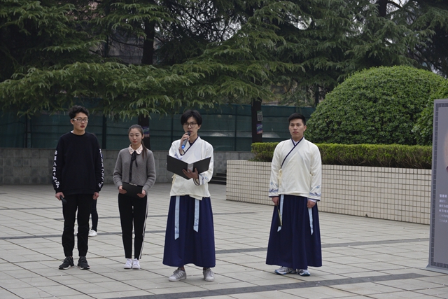 我校百草诗社和心路话剧社的同学们朗诵了《寒食野望吟》、《六州歌头》、《清明节,怀念父亲》、《正气歌》四首诗词,师生依次为先烈们献上了鲜花,表达他们对先烈们诚挚的敬意和深深的怀念。
