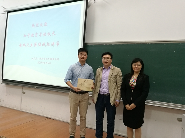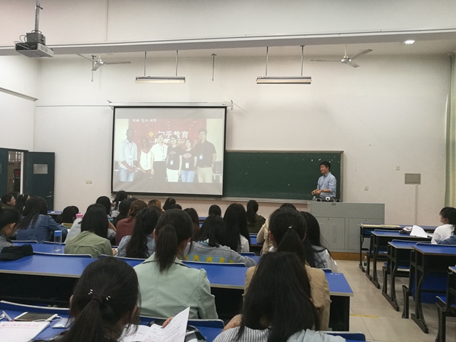 5月5日下午,外国语学院邀请我校2011届毕业生、扬州知乎教育培训学校校长唐鹏在浦口校区举行“越努力、越幸运”主题创业讲座。外国语学院党总支副书记黄晓波主持讲座。外院各年级140多位同学听取讲座。