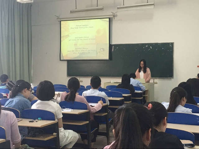 张莉作总结。她指出,作为一名未来的英语老师,同学们应该注意语言素养和教育素养的双重技能训练,既有基础的语音语调、听说读写的训练,也应关注学科教学研究素养的积累。她希望大家在平时的训练中积极探索,形成“比、学、赶、帮、超”的氛围,共同提高,共同进步。
