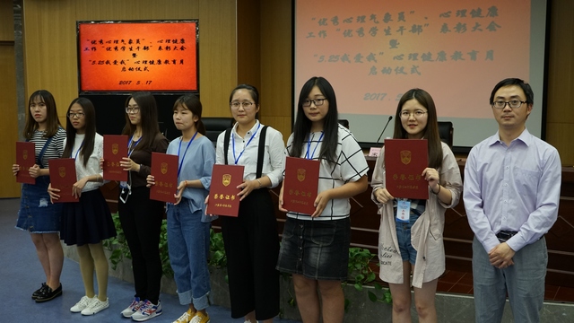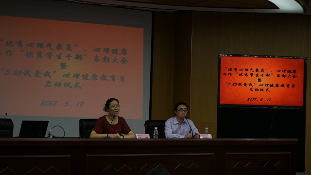 5月17日晚,学工处在草场门校区举行“2017年优秀心理气象员”、心理健康工作“优秀学生干部”表彰大会暨“5.25我爱我”心理健康教育月启动仪式。学工处处长刘莹出席活动。学工处副处长宋学军主持活动。