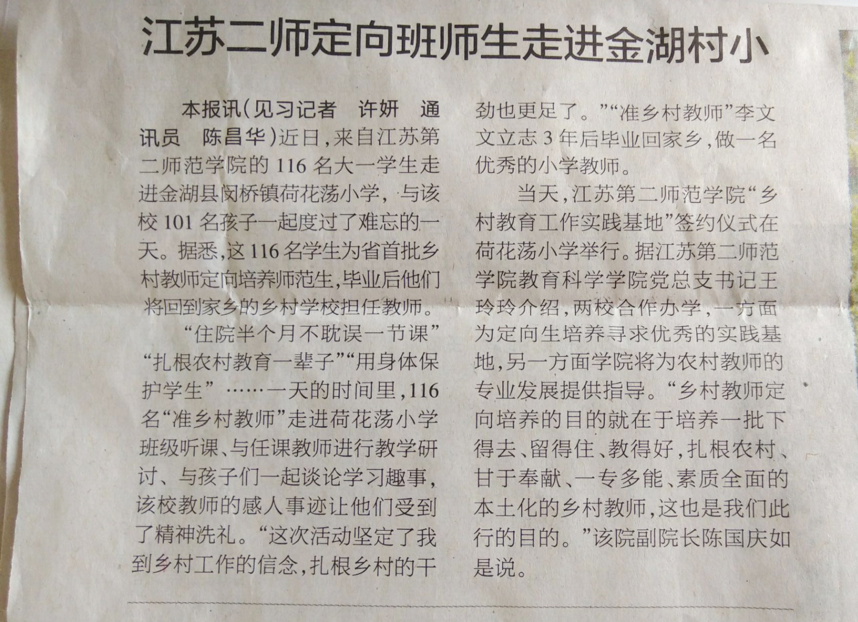 [江苏教育报] 江苏二师定向班师生走进金湖村小