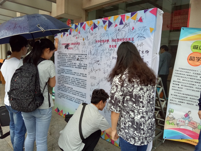 当日中午在树人斋学生公寓门口开展“防范校园贷”主题签名墙活动。该院学生会向同学们宣传介绍校园贷款的基本常识以及所带来的危害,并就同学们的相关咨询一一进行解答。尽管下着大雨,同学们的热情仍不减退,撑着伞认真学习海报以及宣讲内容,并用自己的签名承诺来表达决心:合理消费、远离校园贷!