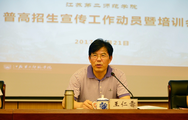 王仁雷作动员讲话。他肯定了我校近几年招生宣传工作所取得的成绩,并就做好今年招生宣传工作提了三点要求:一是思想重视,要充分认识到生源质量为学校“立校之本”,生源质量是学校的核心竞争力;二是熟悉政策,招生宣传人员一方面要加强招生政策和业务知识的学习,另一方面要熟悉所辖片区的生源地中学情况,更好地为考生服务;三是组建团队,要精心选拔招宣工作人员,招宣工作人员要备好课,放下身段,热情服务,把温暖带给学生;四是加强考核,学校将从各个方面对招生宣传工作的效果和成绩进行考核,为更好地推进招生宣传工作的开展打下基础;五是统筹兼顾,做好招生宣传工作的同时,要保质保量地完成毕业生离校、期末监考等工作,确保学校各项工作有序开展。