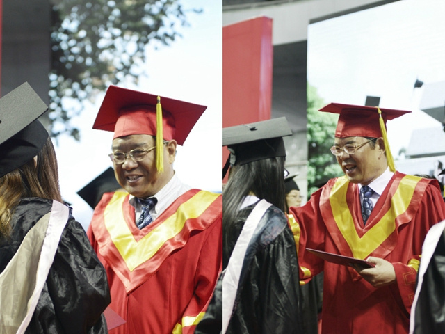 随后进行毕业证书颁发仪式及学位授予仪式,校领导、二级学院负责人、主要职能部门负责人为全体毕业生颁发毕业证书,为每一位学士学位获得者扶正流苏、授予学位证书并合影留念。