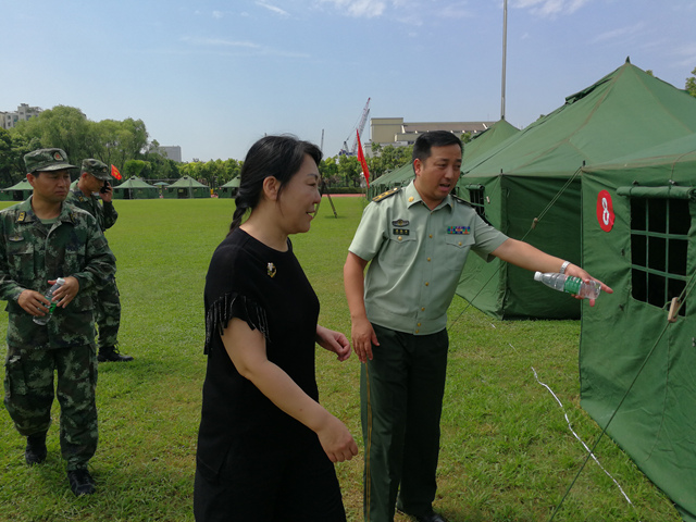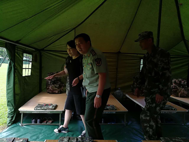 在薛振林的陪同下,刘继红一行参观了战士们在操场上搭建的营房、临时伙房、活动室等。刘继红转达了学校党政对集训官兵的问候,并细心询问是否还有需要协调解决的问题,她表示学校一定积极做好军校共建工作,为部队提供力所能及的服务,也期待在2017级新生军训工作中得到武警南京支队的支持。陈朝兵表示,感谢学校为部队集训提供的场地和各种帮助,经过几十天的集训,战士们一定会以饱满的精神状态投入到学校2017级新生的军训工作中,相信军训工作一定能达到预期的效果、取得圆满的成功。