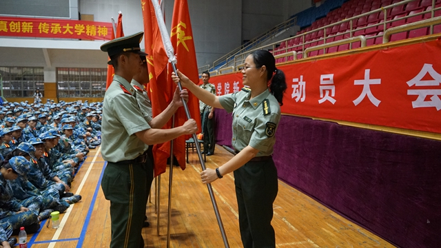 最后,刘莹向军训团授军训团团旗,为各连连长授军训连连旗。