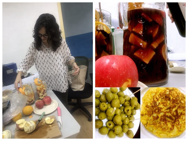 来自西班牙大学联盟的外教MARTA介绍了西班牙美食的发源和特色,着重介绍了西班牙代表性美食——TORTILLA(土豆饼)的制作材料和制作过程,并鼓励在场的同学自己动手制作TORTILLA(土豆饼)。外教还介绍了如何在西班牙餐厅点饮料,并现场制作了西班牙特色饮料——SANGRIA(桑格利亚)。在轻快的西班牙音乐中,同学们一边品尝西班牙美食——TORTILLA(土豆饼)和饮料SANGRIA(桑格利亚),一边跟外教学习简单的西班牙语。