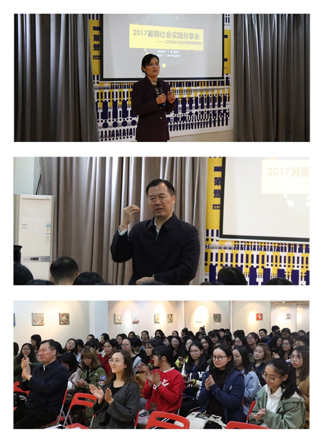为发挥大学生暑期社会实践在帮助青年学生受教育、长才干、做贡献等方面的积极作用,引领广大青年学生以青春建功的实际行动给党的十九大献礼,10月30日下午,美术学院2016、2017级全体美术师范定向专业的同学齐聚艺体楼五楼艺术交流中心,举办2017暑期社会实践分享会。2016级美术学定向班“1+1+1”工程第二班主任、副校长祝兴成,教师教学发展中心主任刘晓红应邀出席活动,美术学院副院长路明,指导老师、美术学院党总支书记丁莹及辅导员章砚文参加活动。