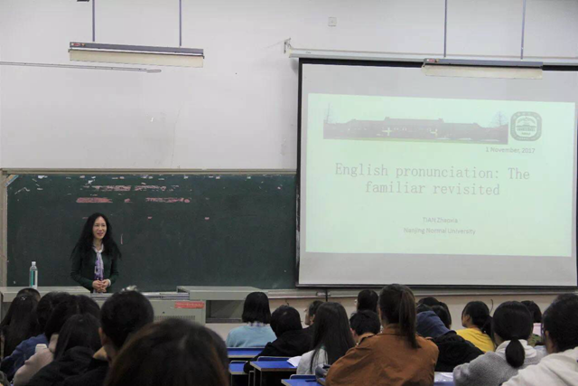 11月1日下午,外国语学院举行名教师教育教学思想系列讲座之——“中国学生的英语语音问题及对策”。南京师范大学外国语学院副院长、硕士生导师田朝霞教授应邀主讲。刘连营等二十余名教师以及全体17级新生听取讲座。郭大光主持讲座。