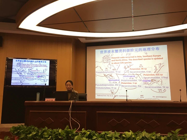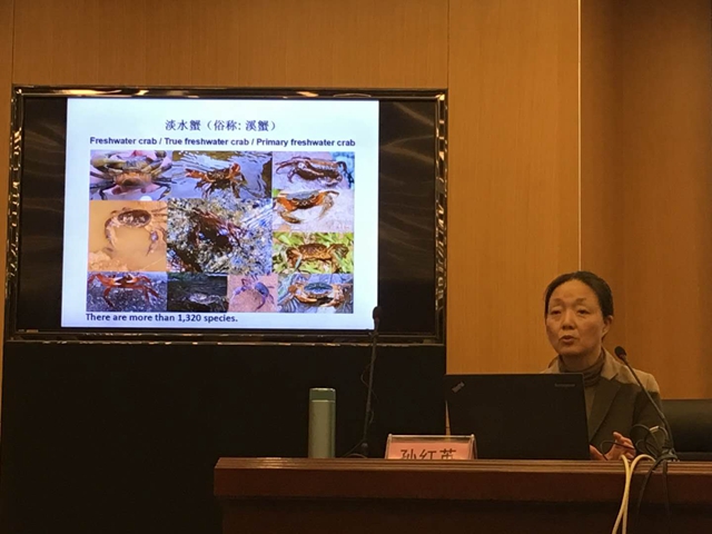 孙红英教授回顾了中国淡水蟹类区系和分类的研究历史,介绍了其课题组所开展的中国淡水蟹类物种多样性野外调查和保护研究,重点介绍了长江流域溪蟹科淡水蟹的多样性分布格局及其变化趋势。报告中,孙教授还同师生们一起分享了她和学生们对淡水蟹类野外调查和标本采集的有趣经历。