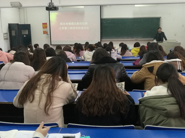 为帮助我校2018届本科毕业生更好地了解南京市教师招聘录用政策,促进学生高质量就业,11月29号下午,栖霞区教育局专程前往我校浦口校区举办教师招聘宣讲会,招生就业处副处长杨嵘参加本次活动。