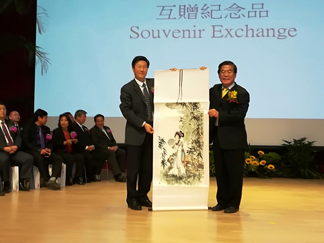 10日,王建出席台湾屏东大学四周年校庆大会并和屏东大学校长古源光互赠纪念品。在屏东大学校庆系列活动“大学•未来”校长圆桌论坛上,王建作了主题演讲,并和参加论坛的海内外多所院校校长进行了良好互动。