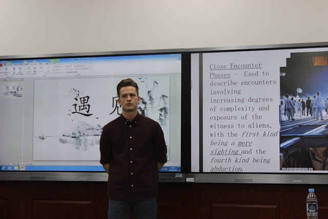第三部分,我校两名外籍教师的表演。来自法国的Kevin给大家朗读了《悲惨世界》里冉·阿让和警长沙威的遇见;来自美国的Seth讲述“遇见”这个主题联想到的斯皮尔伯格的电影“第三类接触”,带领大家一起“遇见”了外星人。
