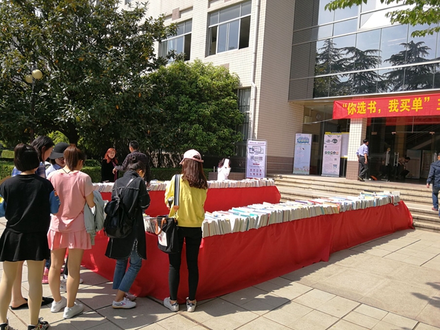 4月18日、19日、20日,图书馆分别在小行、浦口和草场门三校区举行第五届读书节系列活动之一 ——“你选书我买单”主题书展活动。在本次活动中,图书馆采编部邀请了签约馆配商“北京人天书店有限公司”为各校区展场提供了4016种近期出版的精品图书,供读者现场自由采选,内容涵盖社会科学、人文艺术和自然科学等各个学科专业。在举办现采活动的同时,所有参展书目均通过图书馆网站向全校师生开放,以供读者进行网络采选。