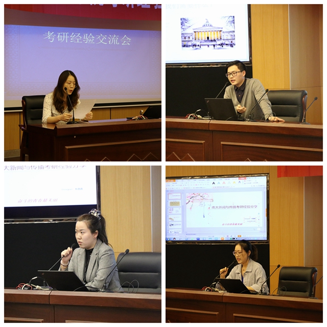 2018届毕业生中考上国内外研究生的优秀学生分别进行了经验分享:考取南京师范大学新闻与传播学院研究生的胡颖同学强调了专业课的重要性;考取南京大学新闻与传播学院研究生的郭晶晶同学建议多关注一些外部信息。成功申请英国拉夫堡大学研究生的李杜白同学强调了英语学习的重要性;成功申请英国伦敦大学研究生的姚天鹏同学则分享了留学申请材料制作中的注意事项。