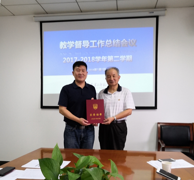 潘文为今年荣退的教学督导代表王绍铭颁发荣誉证书,教务处副处长陈蓓致颁奖辞。潘文充分肯定了本学期教学督导工作,对各位督导的辛勤奉献表示感谢,并对教学督导提出三点期望:一是要继续支持和关心学校发展,继续为学校教学规范管理作出贡献;二是要为学校教学工作出谋划策,以进一步推进教学改革,不断提高教学水平;三是要明确教学督导主体责任,从“督教”“督学”“督管”三个方面开展督导工作。