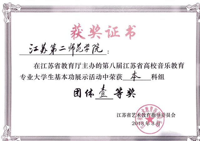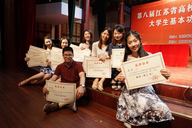 8月21日、22日,由江苏省教育厅主办的全省第八届普通高校音乐教育专业大学生基本功比赛在南京举行。根据规定,我校音乐学院选派陈芷祺(推荐)、王淞(抽签)、江婷婷(抽签)三位同学代表我校音乐学专业学生参加钢琴演奏、歌唱与伴奏、自弹自唱、器乐演奏、合唱指挥、微课等项目的角逐。最终,在参赛的16所本科院校队伍中,我校获团体一等奖;陈芷祺、王淞、江婷婷三位同学也分获个人全能一、二、三等奖,并获数项单项奖。