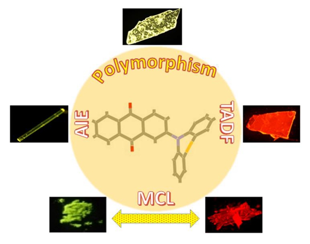 黄博士在香港城市大学李振声(Chun-Sing Lee)教授课题组访学期间,发现了一种多功能有机发光材料——2-(吩噻嗪-10-基)蒽醌(PTZ-AQ)。该材料存在五种聚集态,同时表现出多色发光、多晶型、AIE、MCL和TADF性能。该研究还首次发现,通过调控材料的聚集态,可以系统地调控材料的TADF性能。其中,基于PTZ-AQ的红色晶体,荧光量子产率高达0.848,单线态-三线态能级差仅为0.01 eV,表现出良好的TADF性能。