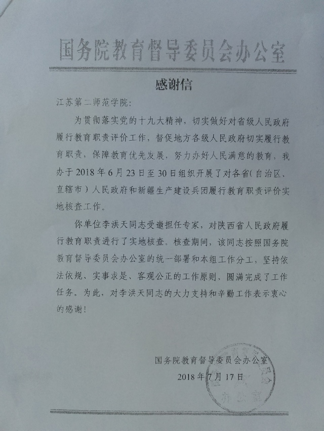 为贯彻落实党的十九大精神,切实做好对省级人民政府履行教育职责评价工作,督促地方各级人民政府切实履行教育职责,保障教育优先发展,努力办好人民满意的教育,国务院教育督导委员会办公室于2018年6月23日至30日组织开展对各省(自治区、直辖市)人民政府和新疆生产建设兵团履行教育职责评价实地核查工作。李洪天同志受邀担任赴陕西省的实地考察专家。感谢信说,在核查期间,李洪天同志按照国务院教育督导委员会办公室的统一部署和工作分工,坚持依法依规、实事求是、客观公正的工作原则,圆满完成了工作任务。为此,国务院教育督导委员会办公室致信我校,对李洪天同志的大力支持和辛勤工作表示衷心的感谢。