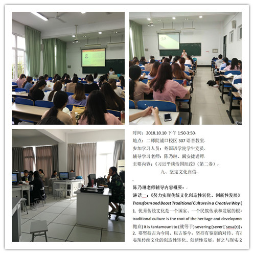 10月10日下午,由英语专业教师陈乃林和阚安捷带领,该院学生集中学习了《习近平谈治国理政》第二卷中的第九个专题——坚定文化自信。陈乃琳就习近平第一至第五次讲话内容进行了详细解读,让大家深刻体悟到英文翻译中的“信、达、雅”标准,理解英语专业学习的重要性。阚安捷就讲话内容提出相关问题供大家思考与讨论。