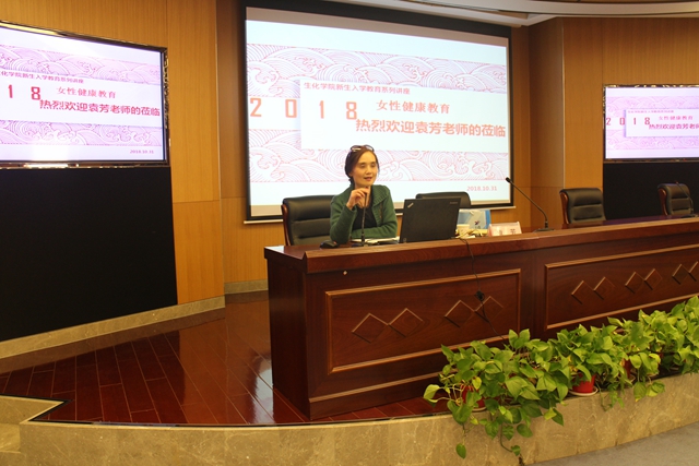 10月31日下午,生化学院在草场门校区现代教育技术大楼二楼报告厅举办“女性健康教育”讲座,校卫生所原所长袁芳应邀主讲。该院党总支书记陈建琴主持活动,来自5个专业的153名大一女生参加活动。