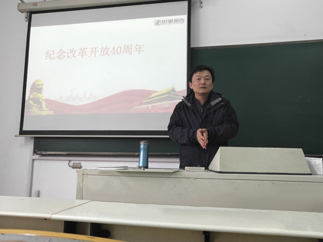 徐孝彬从同学们的生活切入,比较了两代人在吃、住、行等方面的巨大变化,讲述了改革开放四十年沧海桑田的变化,阐述了三个方面内容:一、只有改革开放才能发展中国。改革开放是中国的第二次革命,促进现代化事业和社会主义事业的发展;改革开放是解放和发展生产力的必然要求,是适应新科技革命和时代发展的必然要求。二、改革开放40年的辉煌成就。从封闭性经济弱国到开放性全球经济大国,中国迅速成长跃升为世界第二大经济体;从贫穷到温饱再到整体小康,居民收入不断迈上新台阶,人们的需求层次越来越高;从世界舞台边缘日益走近世界舞台中央,2001年,加入世界贸易组织,成为中国全面重返世界舞台,融入全球化进程的标志性事件。三、将改革开放进行到底。坚定不移全面深化改革,走中国特色社会主义道路,强国之路,富民之路,以更大力度推进改革开放。