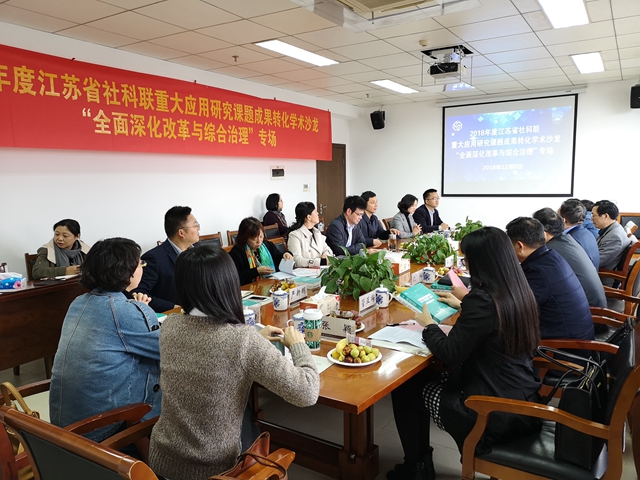 11月8日,由江苏省社科联主办,我校社科联承办的2018年度江苏省社科联重大应用研究课题成果转化学术沙龙“全面深化改革与综合治理”专场在我校举行。江苏省社科联党组成员、副主席徐之顺,省社科联科研中心主任徐海军,江苏省发改委规划处处长孙志高,江苏省委研究室经济处处长吴权,我校副校长刘贵友,各课题组负责人等出席会议。我校科研处副处长王淑芬主持会议。
