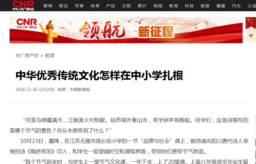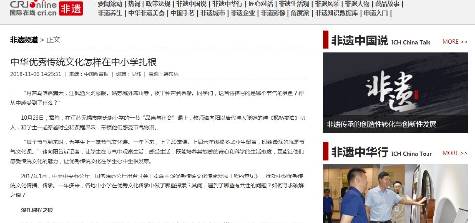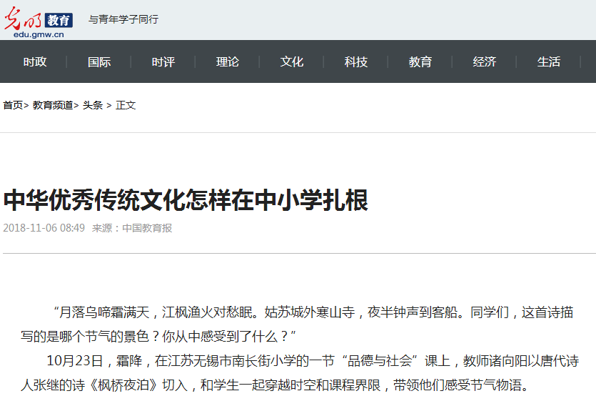 11月6日,中国教育报第八版报道了我校“传统文化国培计划示范项目”建设情况。人民网、光明网、中央人民广播网、中国社会科学网、中国教育新闻网、国际在线、江苏省传统文化促进会等多家国家级主流媒体转载了该报道。