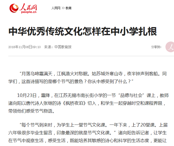 10月23日,霜降,在江苏无锡市南长街小学的一节“品德与社会”课上,教师诸向阳以唐代诗人张继的诗《枫桥夜泊》切入,和学生一起穿越时空和课程界限,带领他们感受节气物语。