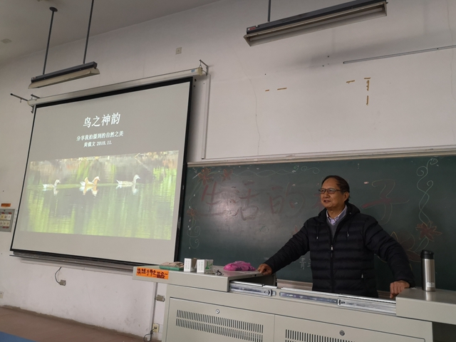 黄载文教授喜欢拍摄飞鸟,他的拍摄足迹遍布南京大小景点,只为拍摄“鸟之神韵”。他分享了自己拍摄飞鸟题材照片的经历,以自己的拍摄成果和具体拍摄细节启发大家在生活中要存爱美之心、留意身边小事,善于发现生活中的美好,并且为之付出持之以恒的努力。他还讲述了他在业余时间与南京其他志愿者一起自发守护南京市情侣园的鸳鸯宝宝健康成长的故事。讲座使同学们不仅欣赏了诸多精美图片、了解到拍摄方面的技巧,还感悟到作为一名大学生应备的艺术素养和人文情怀。最后,黄教授向同学们赠送了由他摄影作品制作的书签。
