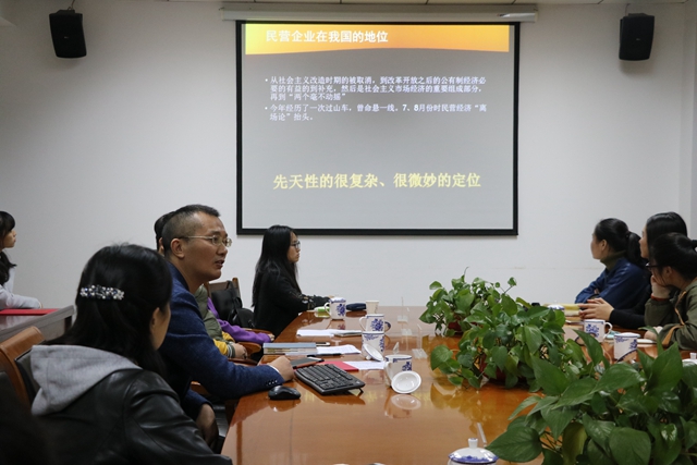 刘贵友介绍了我校目前“师范教育体系齐全,非师范专业也不落下”的基本状况,深化了学生对创新创业的认知。南京皇园投资有限公司董事长周春广代表各位专家发言,表示希望此次合作实现双方共赢。学生代表吕苏颖希和杨紫婷发言,为大家展示了《六月居合租伙伴计划》项目。颁发聘书后,周春广作了题为《当下金融环境下中国企业的突围策略浅析》的报告,对中国民营企业的突围策略进行了分析,对活动项目进行了指导与点评。王曦代表学院感谢各位专家的支持,并表示后续会推进更多讲座为辅、交流为主的系列活动,将创新创业工作做实。