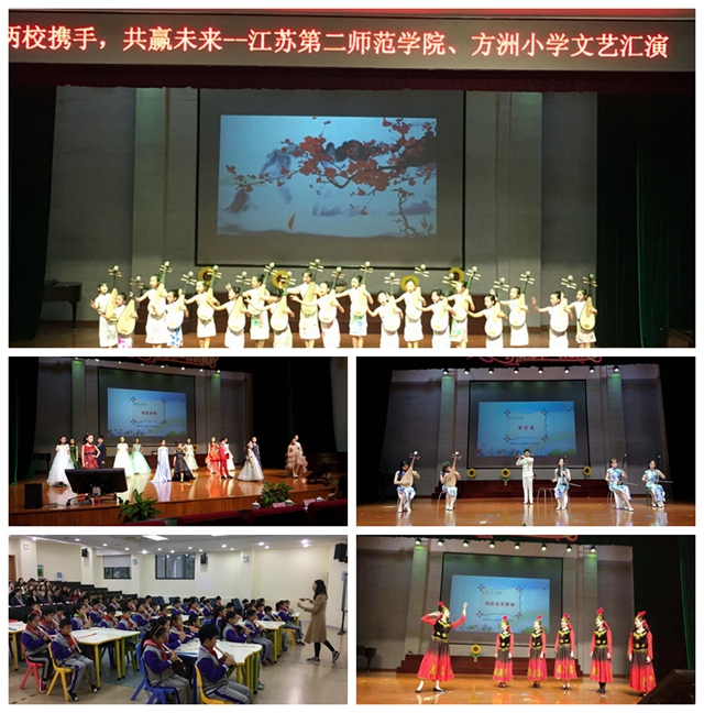 在该校方圆剧场,两校学生共同上演了一台精彩纷呈的音乐会。我校音乐学院学生表演了笛子独奏《姑苏行》、大管独奏《e小调大管协奏曲第一乐章》、男女生二重唱《不忘初心》、女生小合唱《玛依拉变奏曲》、民乐合奏《青花瓷》、琵琶独奏《十面埋伏》等节目,获得了方洲小学师生的好评和喜爱。同学们的表演既体现了我校学生扎实的专业功底和丰富的舞台经验,也将更多传统的民族音乐带到了孩子们中间。方洲小学的学生也进行了精彩的表演。