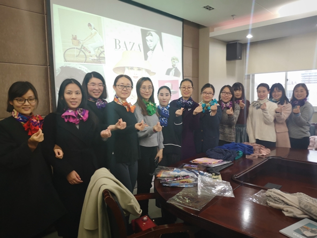 王斐先后讲解示范了方形丝巾、长丝巾、秋冬围巾的多种系法,其间也对围巾颜色的选择与搭配作了指导。在场的辅导员积极参与,现场氛围轻松活跃。活动最后,大家用新学的丝巾系法给自己系上“蝴蝶结”,并合影留念。