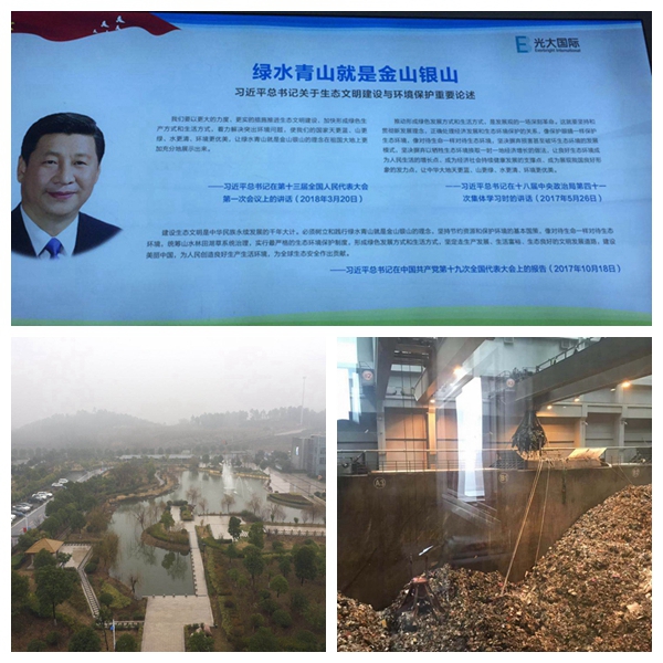 第一站大家参观了光大环保能源(南京)有限公司。公司位于江宁铜井镇,是一座用生活垃圾为燃料的发电厂,日处理垃圾2000吨,是南京每天所产垃圾数量的2/3,配置了4台焚烧炉,2台20MW汽轮发电机组。所有设备均由光大集团及国内企业自主研发制造。厂区内树木花草、湖水喷泉,环境优美。发电厂房是一座巨大的现代化建筑。大厅里是非常醒目的习近平总书记关于生态文明建设与环境保护主要论述的展示牌。该发电厂整个生产过程完全自动化,电子实时监控。废气、废水、废料完全达标(以高于国标的欧盟标准)排放。总控室里,巨大的电子显示屏上显示着四台焚烧炉的工作情况以及排放物的实时分析数据,这些数据与国家环保监测中心联网。