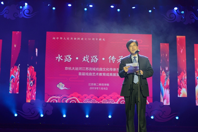 王仁雷致欢迎辞,他指出,京杭大运河是中国古代劳动人民创造的一项伟大工程,是活着的、流动的重要人类遗产,在江苏流域留下了丰富的戏曲文化历史遗存。习近平总书记对大运河文化建设多次作出重要批示,江苏明确提出“三个长廊”的设计,即努力把大运河文化带江苏段建设成为“高颜值的生态长廊、高品味的文化长廊、高效益的经济长廊”。我校一直坚持传统师范教育、江苏地方传统文化教育的“双传统”特色发展,2018年启动了“京杭大运河江苏流域戏曲文化传承与创新工程”,成立“京杭大运河江苏流域戏曲文化传承与创新研究中心”,实施戏曲进校园“五个一工程”,走访名家,记录国家级非物质文化遗产传承人的口述历史;深入剧团,关注各剧种的生存现状;走进校园,探讨戏曲在校园的传承途径。一年来中心组成员撰写了近10万字调研纪实《我们的足迹》,拍摄的一部微电影、一部纪实片都入选首届运河主题国际微电影展;美术学院师生创作近80件油画、国画、书法等有关运河体裁作品,并成功举办《运河怀古——首届京杭大运河江苏流域戏曲文化传承与创新工程美术作品展》;开发首家以戏曲教育教学和传承推广为目的“京杭大运河江苏流域戏曲进校园网络数据库”,包括江苏各曲种收集汇总、戏曲微课视频等丰富资源,《京杭大运河江苏流域戏曲进校园的高端师资培训》项目已通过省艺术基金人才培养项目的终评。此次成果展演,是对工程开展一年来的总结和展示,未来我校还将继续推进该工程,推动江苏省中小学校传统戏曲文化的传承发展。