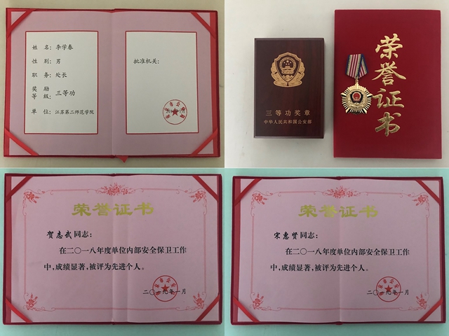 近日,南京市公安局发布《关于表彰2018年度全市内保系统保卫组织先进集体和先进个人的决定》,我校保卫处李学春同志因在2018年度校园安全保卫工作中成绩突出,荣立个人三等功,贺志武、宋惠贤两位同志分别被评为“2018年度全市内保系统保卫组织先进个人”。
