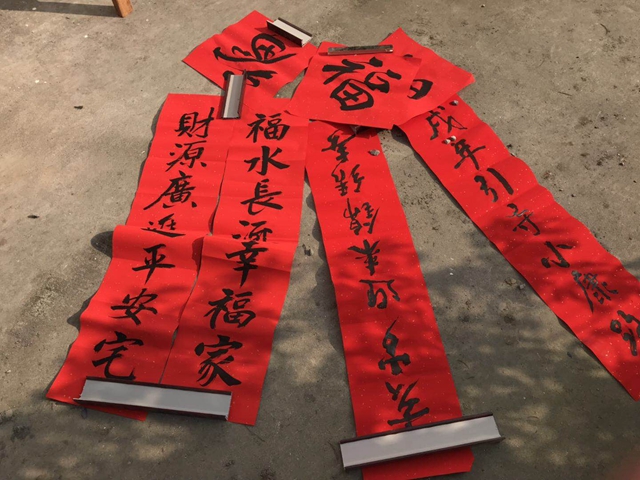 活动现场,师生们泼墨挥毫,娴熟的技艺不时引得村民朋友们的声声赞叹。一幅幅充满温暖和祝福的春联在师生们的妙笔下跃然而出,村民们捧着大红春联笑逐颜开。场面其乐融融,大家感受到了新年的喜庆。
