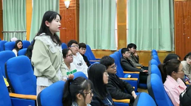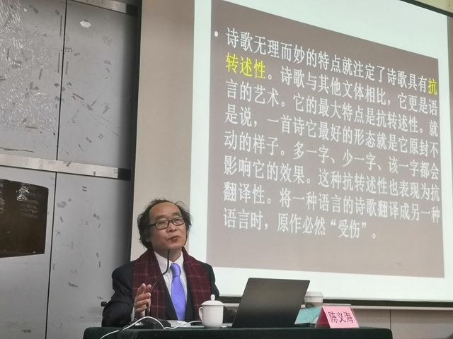 陈教授认为,鉴赏诗歌能锻炼我们的想象力,丰富我们自身的情感。通过对余光中、舒婷等诗人作品意象的赏析解读,陈教授向同学们阐释了意象的本质以及诗歌的“无理而妙”。陈教授鼓励师范生日常进行诵读,他认为坚持朗诵是锻炼自我表达能力的一种有效手段,他在现场示范朗诵了自己的诗作《流浪》,赢得了同学们的热烈掌声。