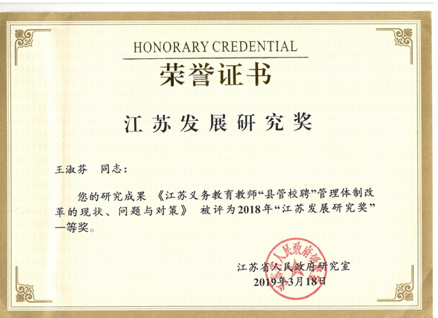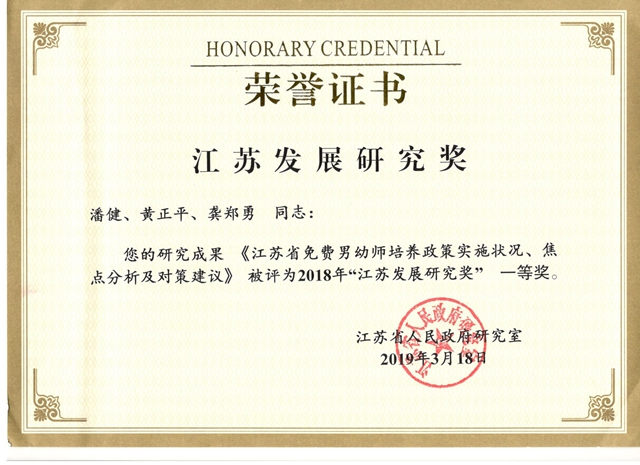 近日,江苏省人民政府研究室公布了“2018年江苏发展研究奖获奖名单”(苏政研〔2019〕6号),我院共有三项研究成果获奖。其中,由王淑芬副研究员撰写的决策咨询报告《江苏义务教育教师“县管校聘”管理体制改革的现状、问题与对策》获评优秀成果一等奖;由潘健教授、黄正平研究员、龚郑勇副教授撰写的决策咨询报告《江苏省免费男幼师培养政策实施状况、焦点分析及对策建议》获评优秀成果一等奖;由宋旭峰研究员撰写的决策咨询报告《建设我省一流高等教育体系的对策建议》获评优秀成果三等奖。